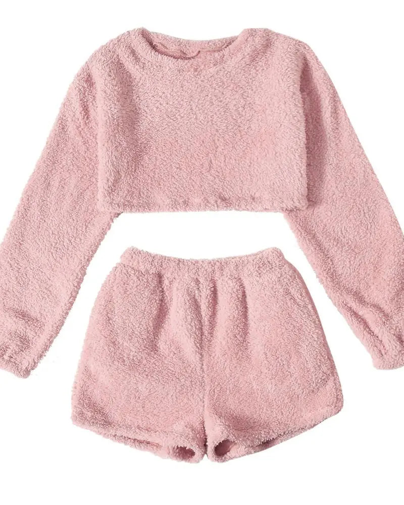 Women's Two Piece Fuzzy Crop Top and Shorts Loungewear