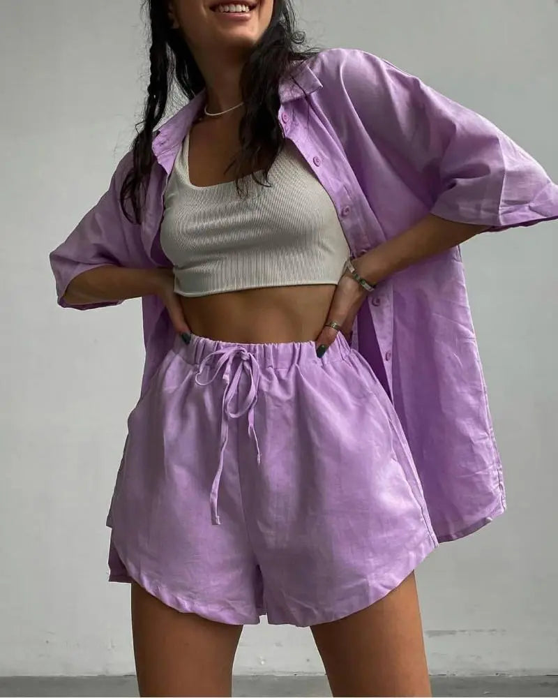 Women's Two Piece 3/4 Sleeve Button Down Shirt And Shorts Outfit