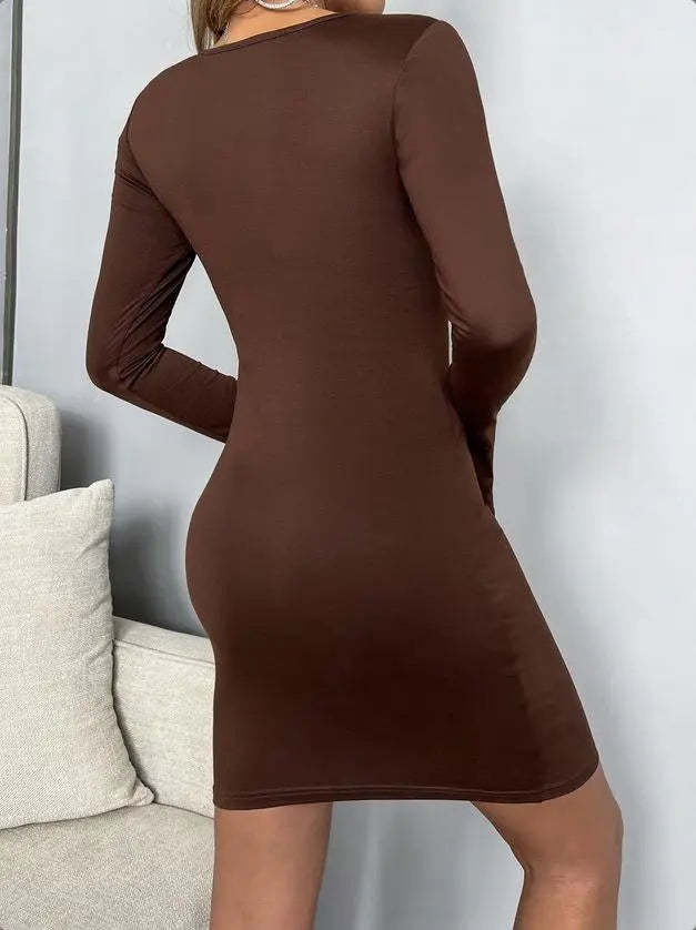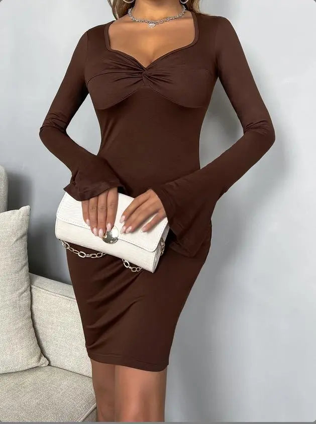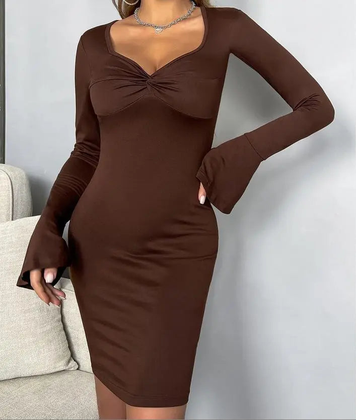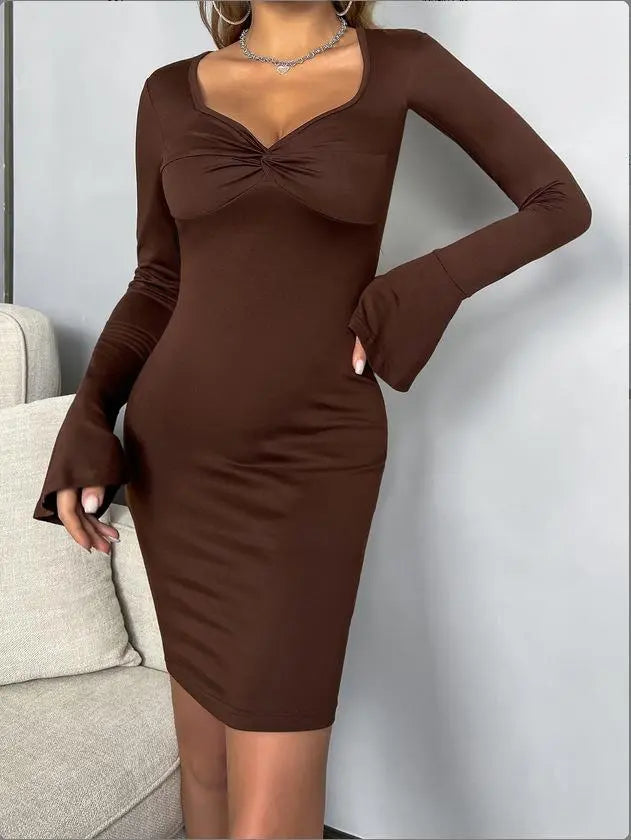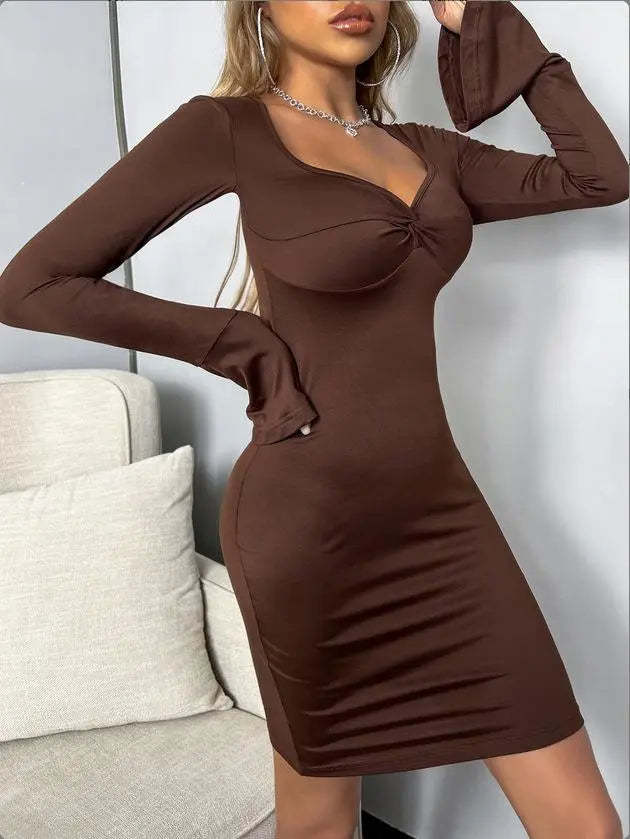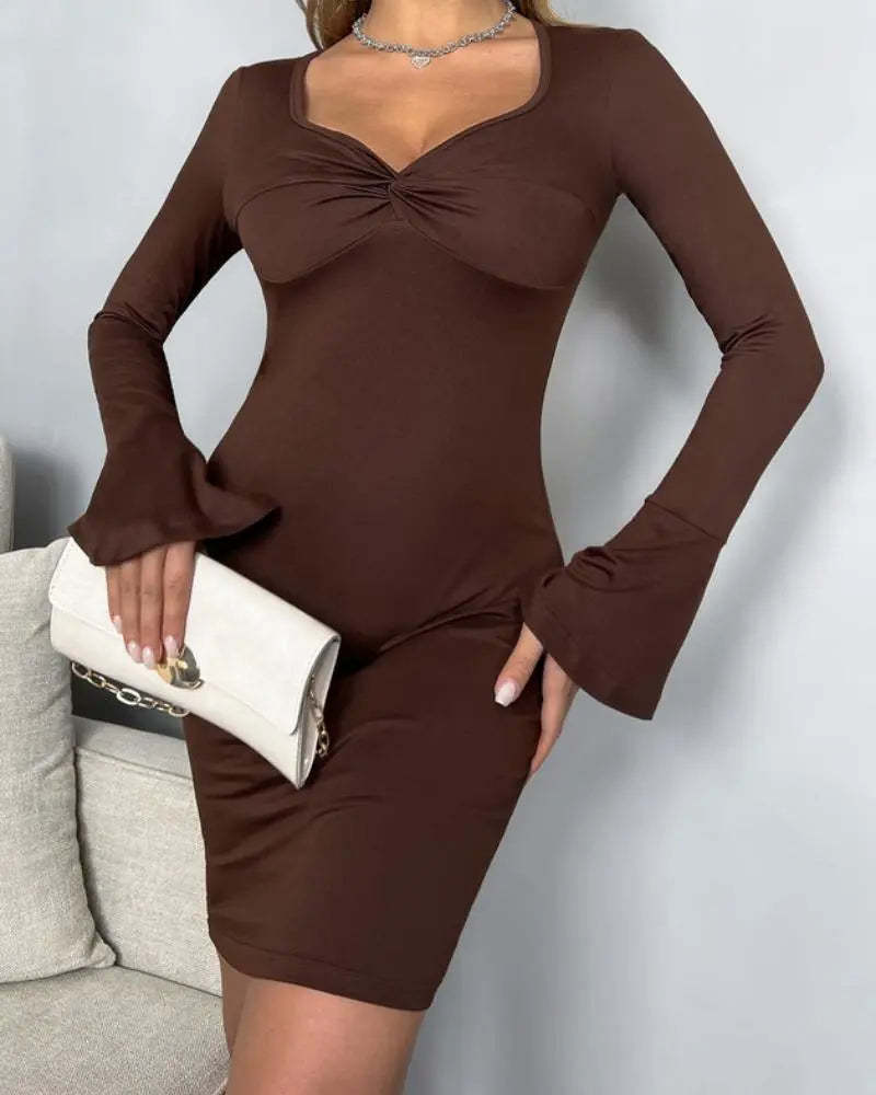 Women's Twist Front Bell Sleeve Solid Mini Bodycon Dress